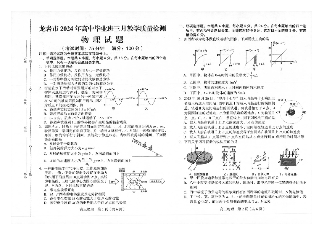 福建省龙岩市2024届高三下学期3月份质量检测一模物理
