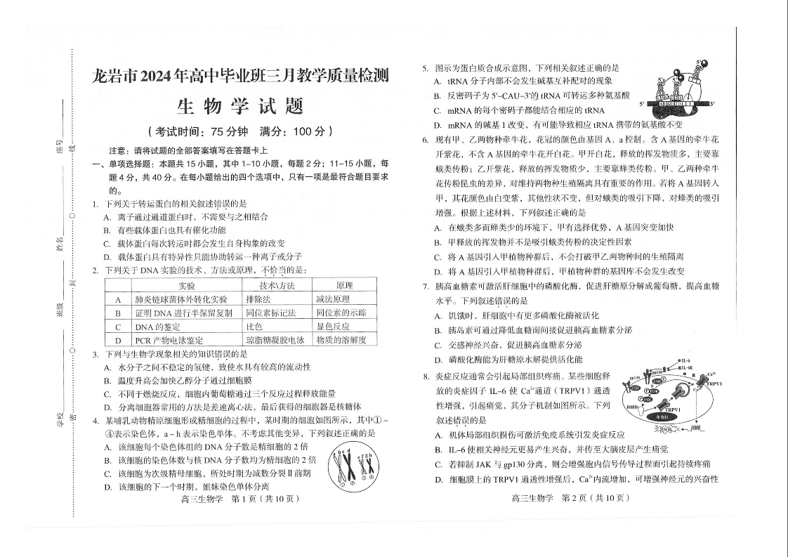 2024届福建省龙岩市高三下学期3月份质量检测一模生物