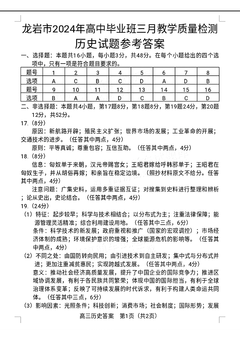 福建省龙岩市2024届高三下学期3月份质量检测一模历史答案