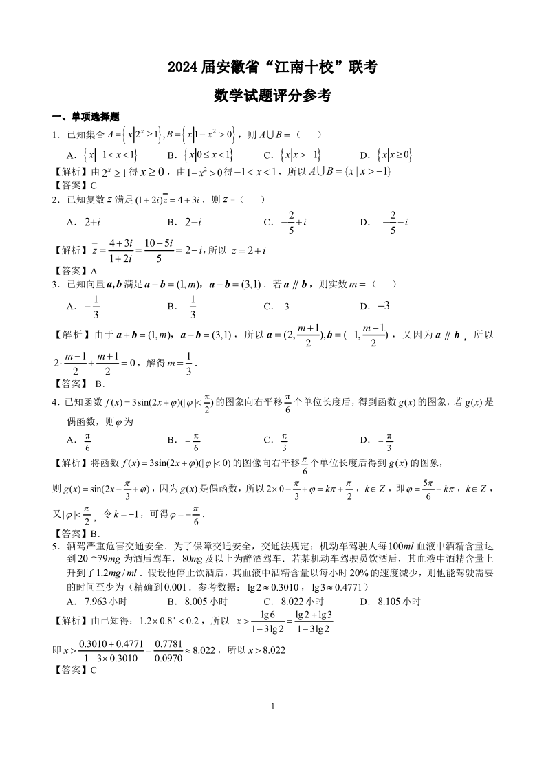 安徽省2024届“江南十校”高三3月联考(一模)数学答案