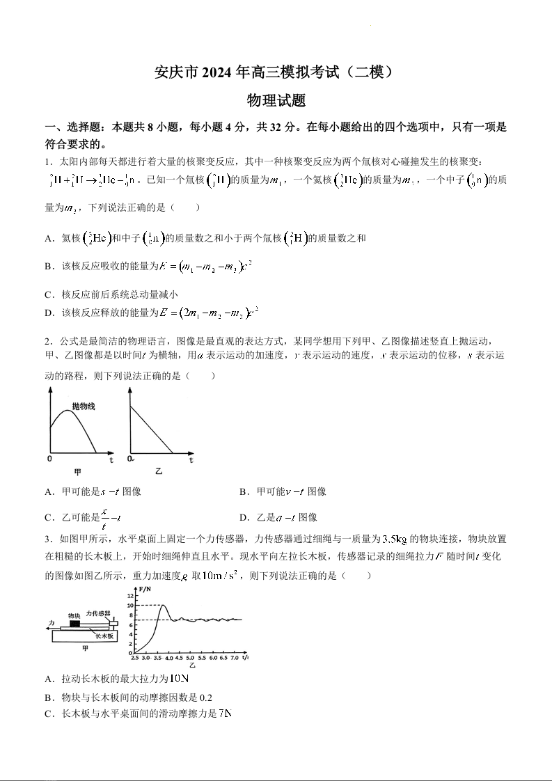 安徽省安庆市2024年高三下学期3月模拟考试(安庆二模)物理