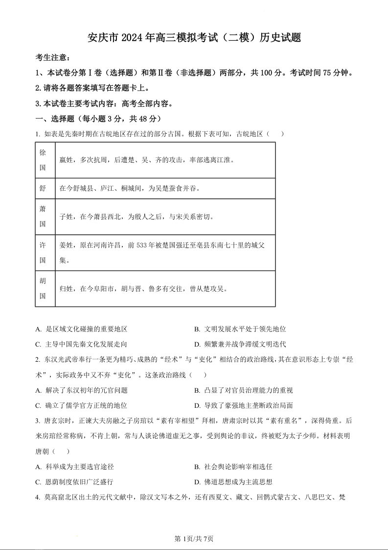 安徽省安庆市2024年高三下学期3月模拟考试(安庆二模)历史(原卷版)