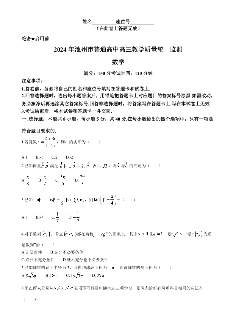安徽省池州市2024届普通高中高三下学期教学质量统一监测(池州二模)数学+答案