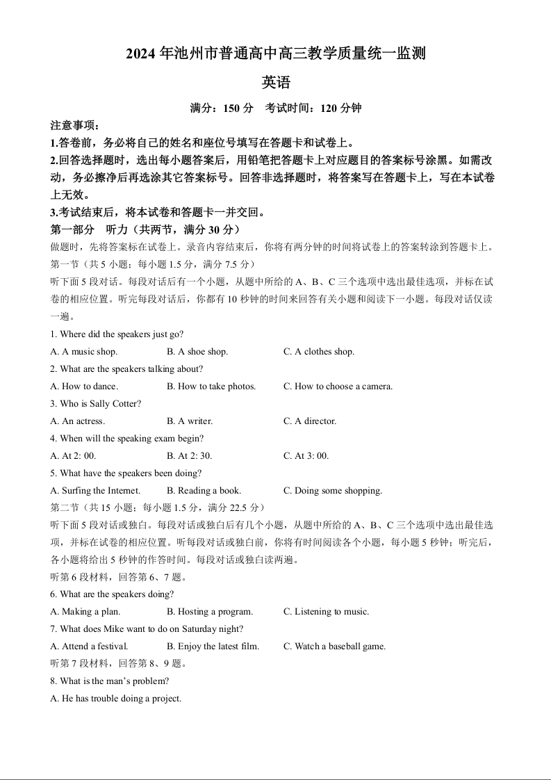 安徽省池州市2024届普通高中高三下学期教学质量统一监测(池州二模)英语+答案