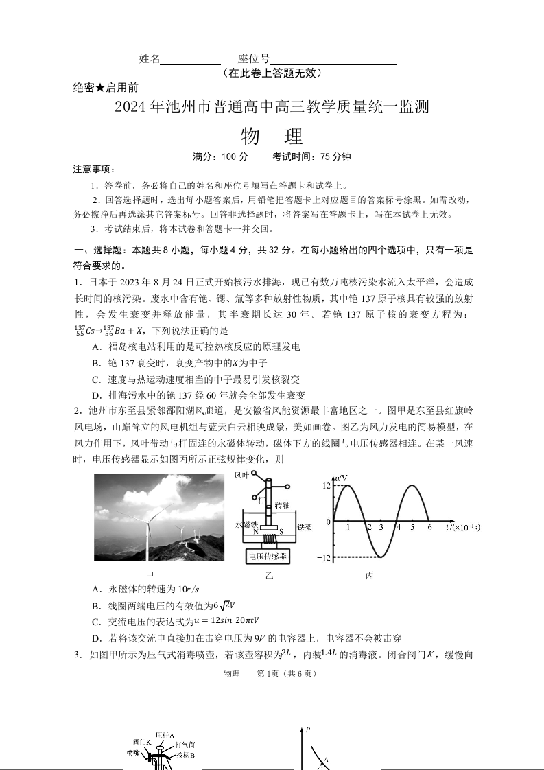 安徽省池州市2024届普通高中高三下学期教学质量统一监测(池州二模)物理