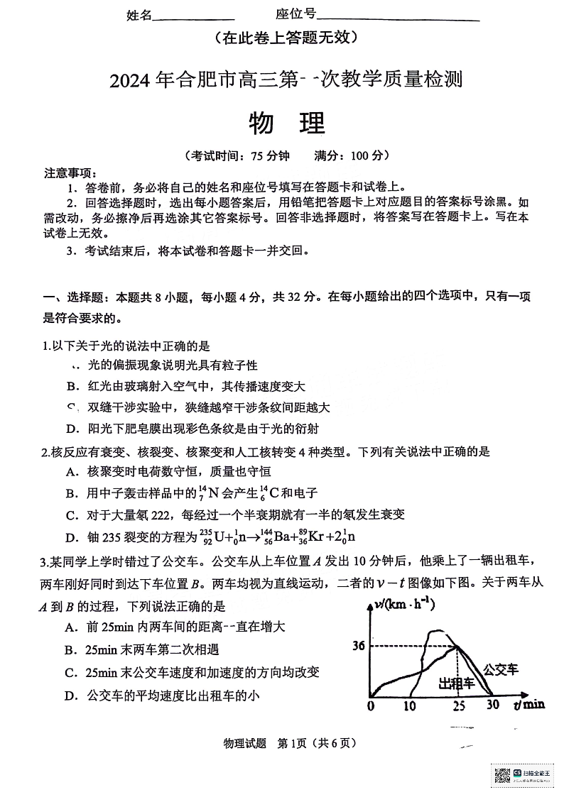 安徽省合肥市2024届高三第一次教学质量检查物理