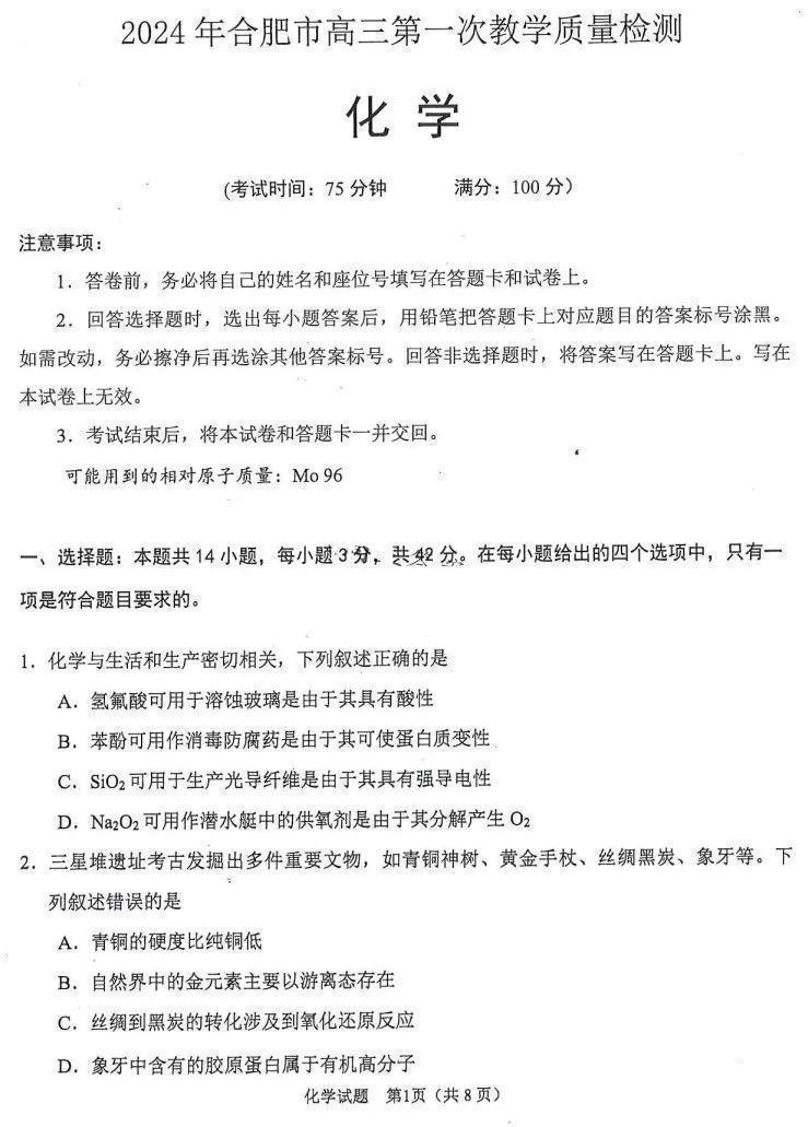 安徽省合肥市2024届高三第一次教学质量检查化学+答案
