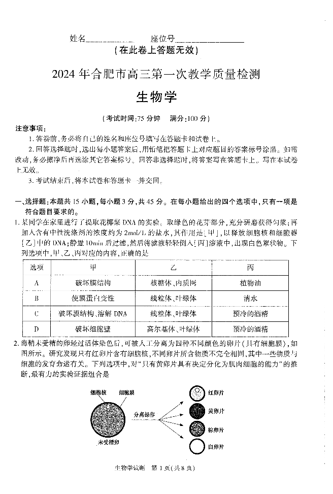 安徽省合肥市2024届高三第一次教学质量检查生物