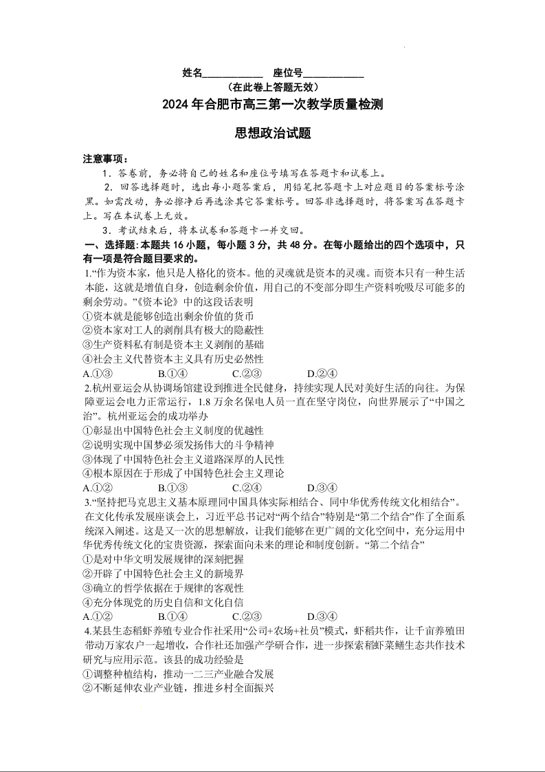 安徽省合肥市2024届高三第一次教学质量检查政治试卷+答案