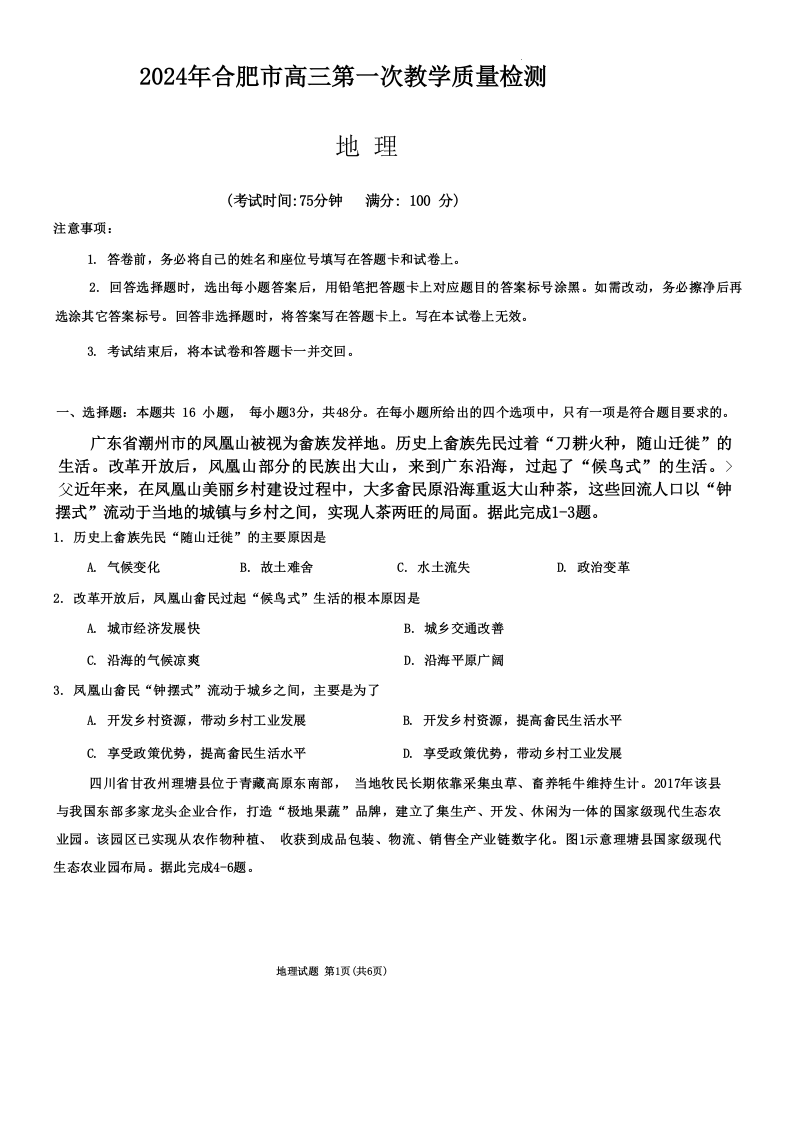 安徽省合肥市2024届高三第一次教学质量检查地理