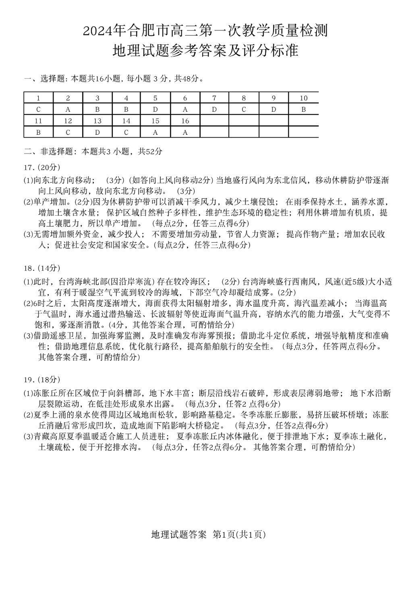 安徽省合肥市2024届高三第一次教学质量检查地理答案