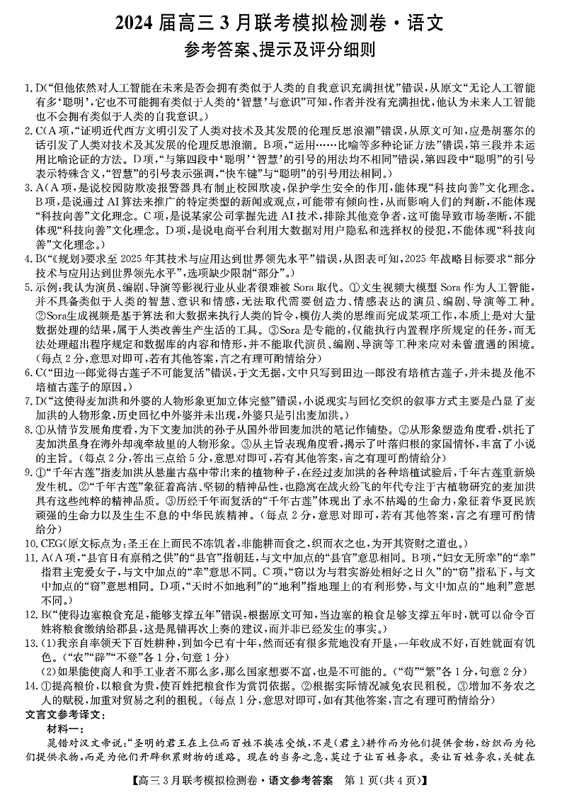 东北三省2024届高三3月联考模拟检测卷语文答案