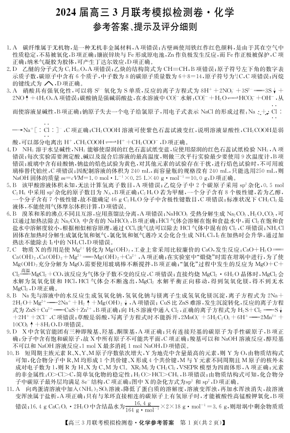 东北三省2024届高三3月联考模拟检测卷化学答案