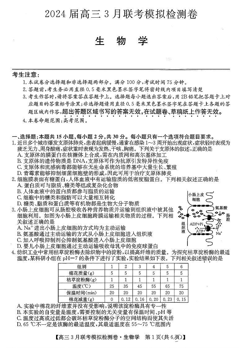 东北三省2024届高三3月联考模拟检测卷生物+答案