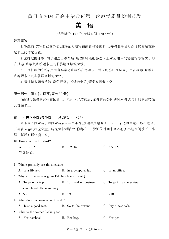 福建省莆田市2024届高三下学期二模英语