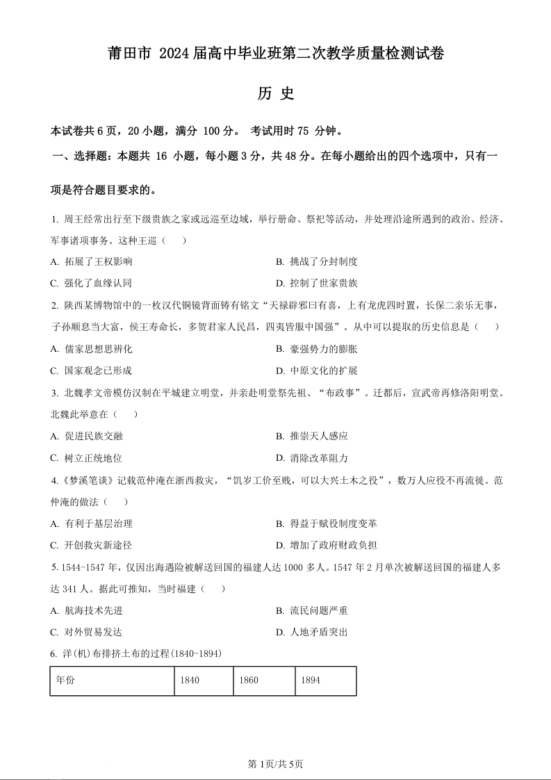 福建省莆田市2024届高三下学期二模历史(原卷版)