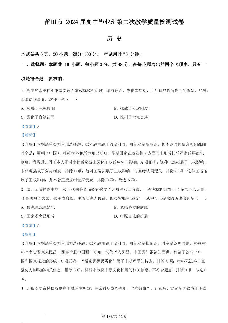 福建省莆田市2024届高三下学期二模历史(精品解析版)