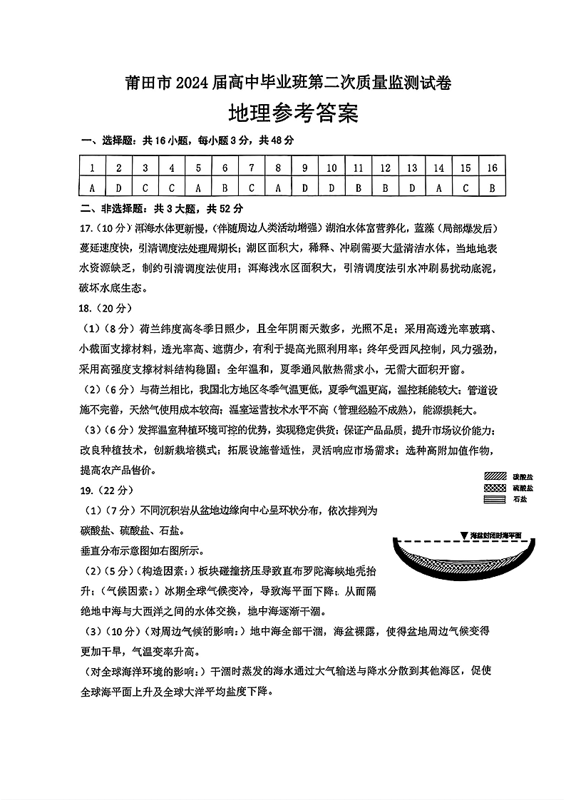 福建省莆田市2024届高三下学期二模地理答案