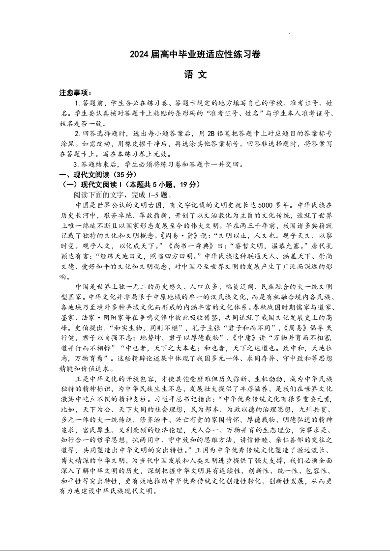 福建省三明市2024届高三下学期3月质检(一模)语文+答案