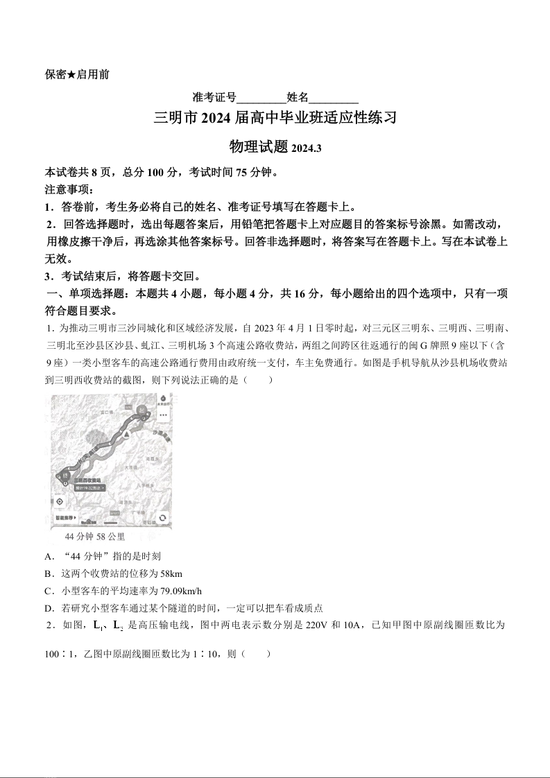 福建省三明市2024届高三下学期3月质检(一模)物理+答案