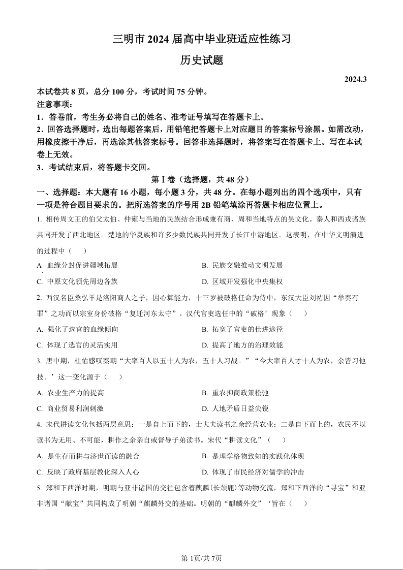 福建省三明市2024届高三下学期3月质检(一模)历史(原卷版)