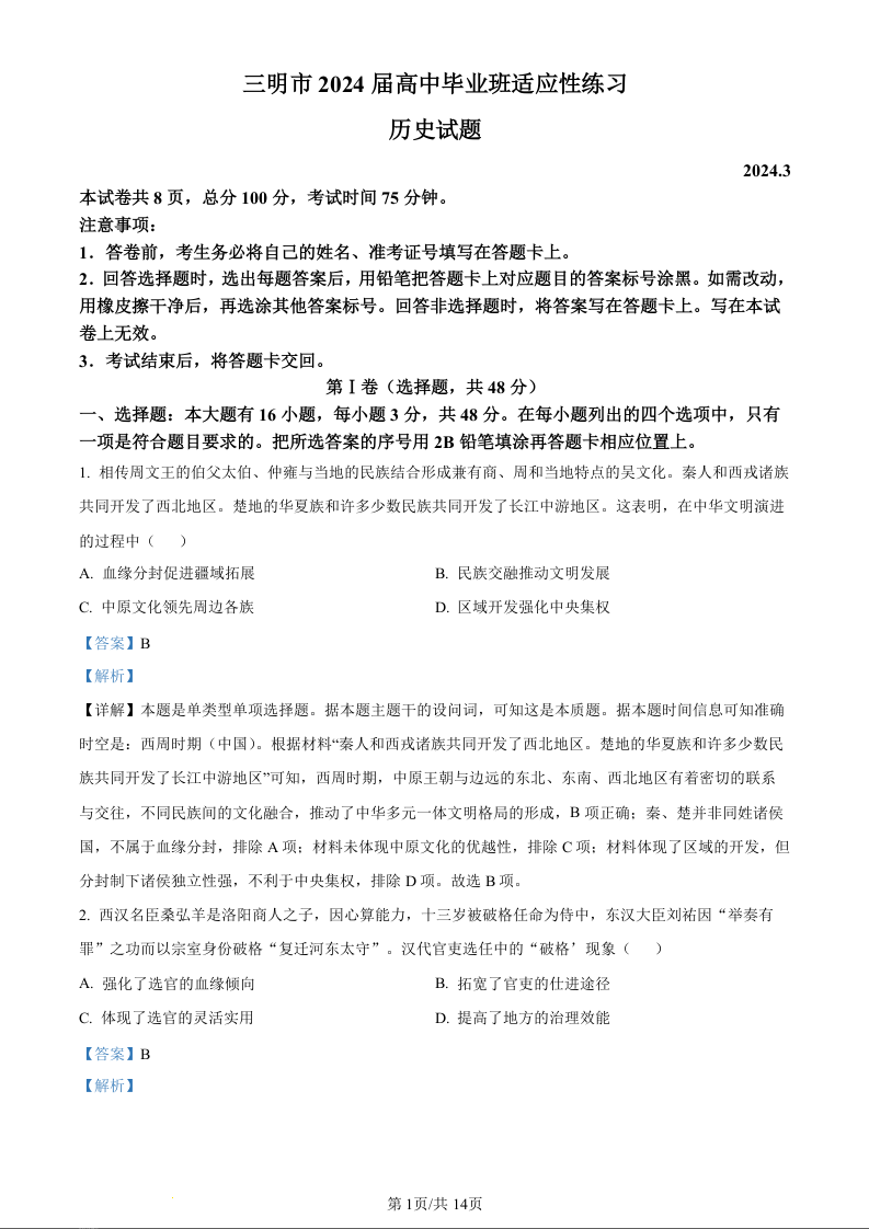 福建省三明市2024届高三下学期3月质检(一模)历史(精品解析版)