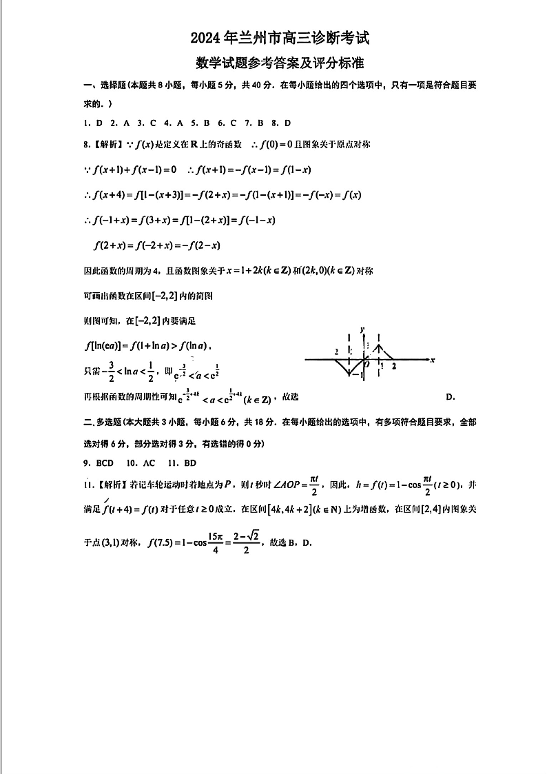 甘肃省兰州市2024届高三下学期诊断考试(兰州一模)数学答案