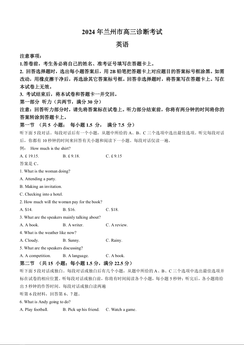 甘肃省兰州市2024届高三下学期诊断考试(兰州一模)英语