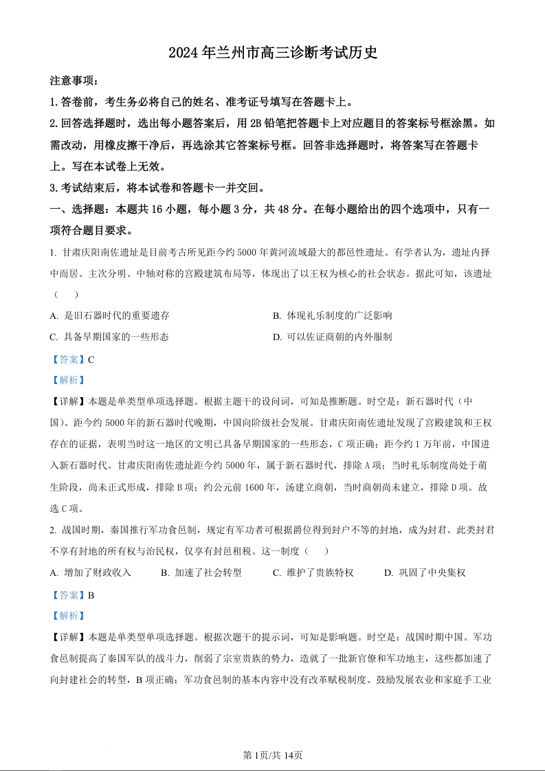 甘肃省兰州市2024届高三下学期诊断考试(兰州一模)历史(精品解析版)