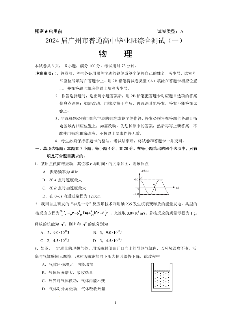 广东省广州市2024届普通高中毕业班下学期一模考试(广州一模)物理+答案