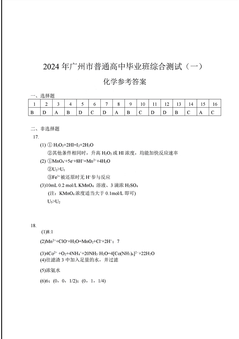 广东省广州市2024届普通高中毕业班下学期一模考试(广州一模)化学答案
