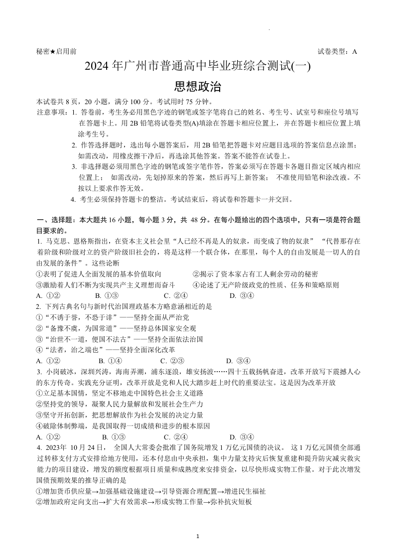 广东省广州市2024届普通高中毕业班下学期一模考试(广州一模)政治+答案