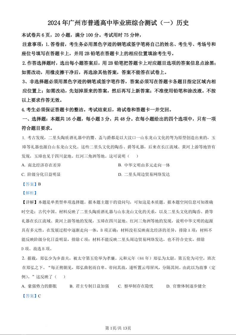 广东省广州市2024届普通高中毕业班下学期一模考试(广州一模)历史(精品解析版)