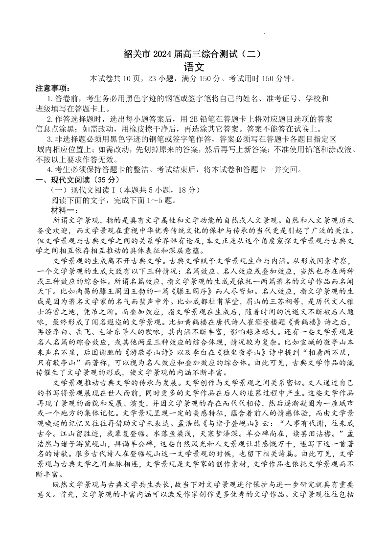 广东省韶关市2024届高三下学期综合测试(二)(韶关二模)语文+答案