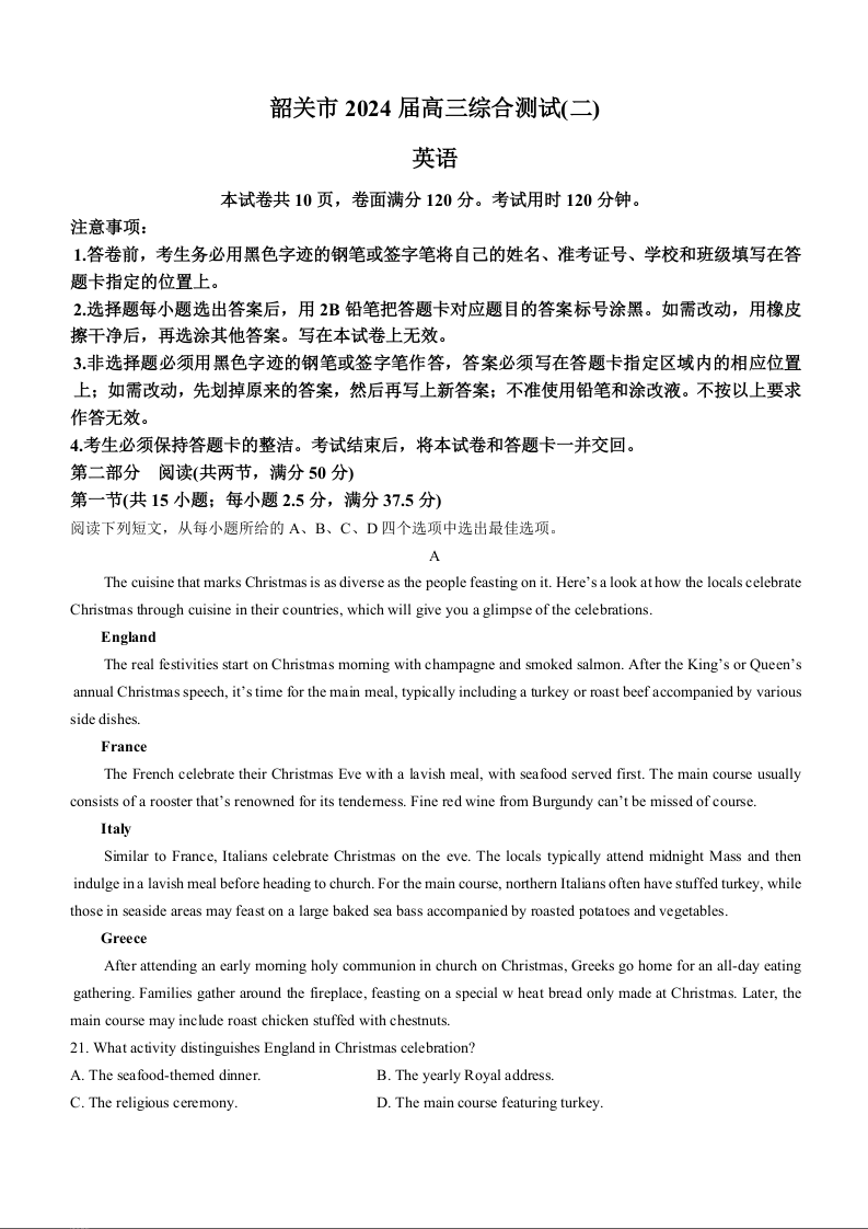 广东省韶关市2024届高三下学期综合测试(二)(韶关二模)英语+答案