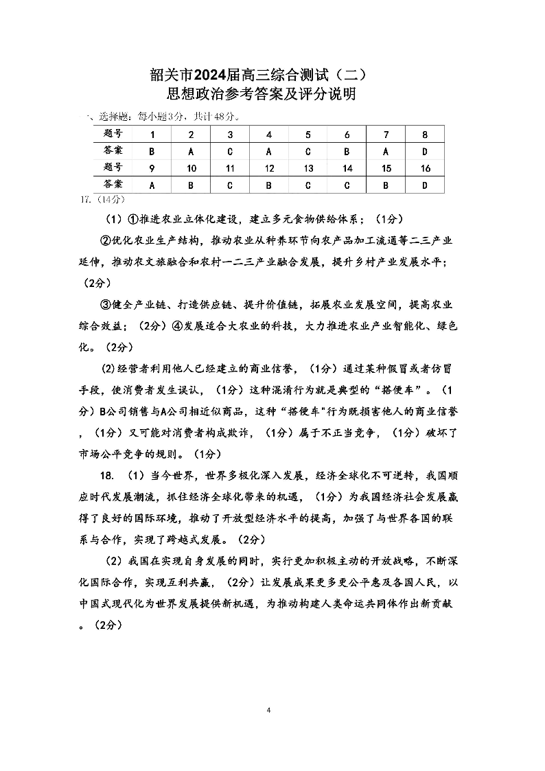 广东省韶关市2024届高三下学期综合测试(二)(韶关二模)政治答案