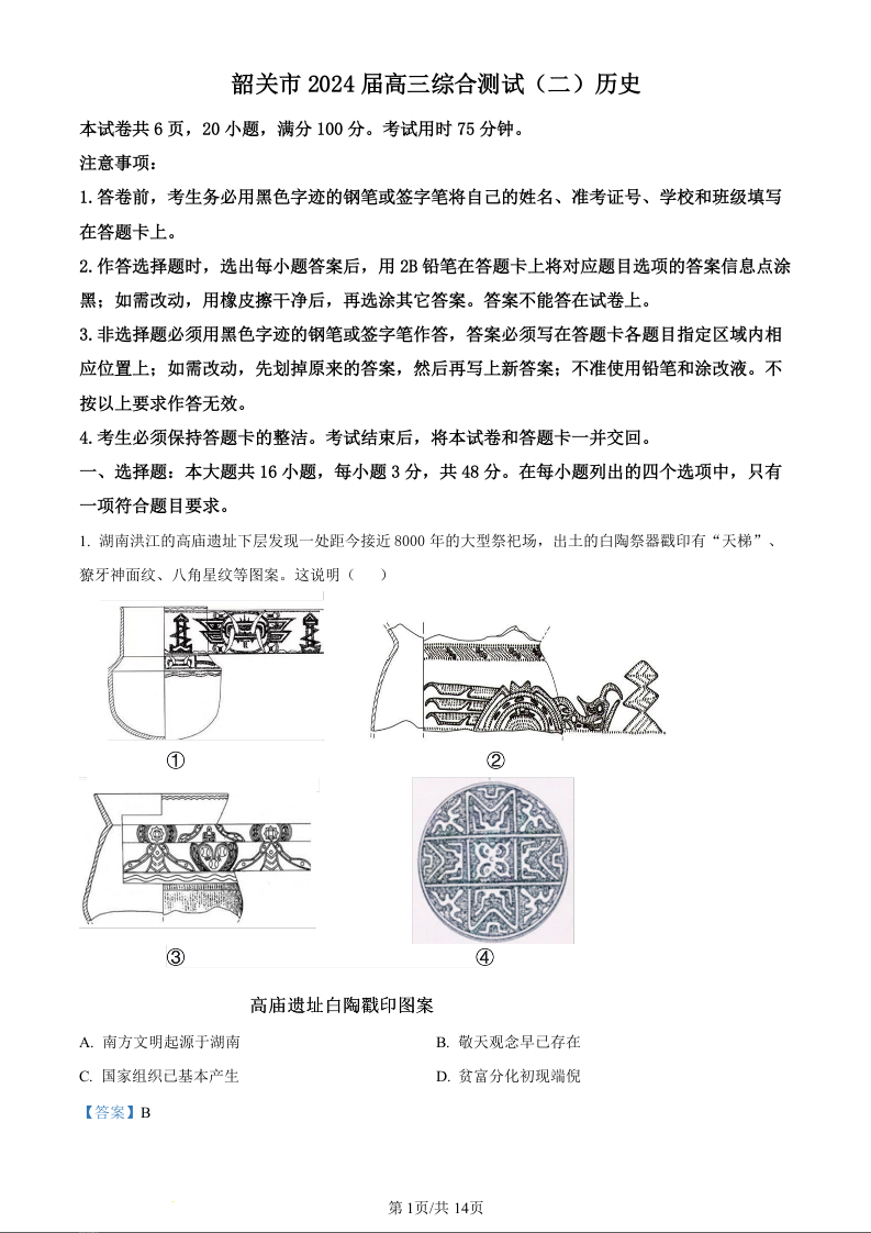 广东省韶关市2024届高三下学期综合测试(二)(韶关二模)历史(精品解析版)