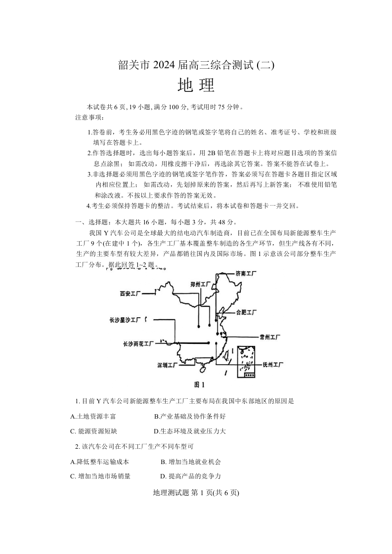 广东省韶关市2024届高三下学期综合测试(二)(韶关二模)地理+答案