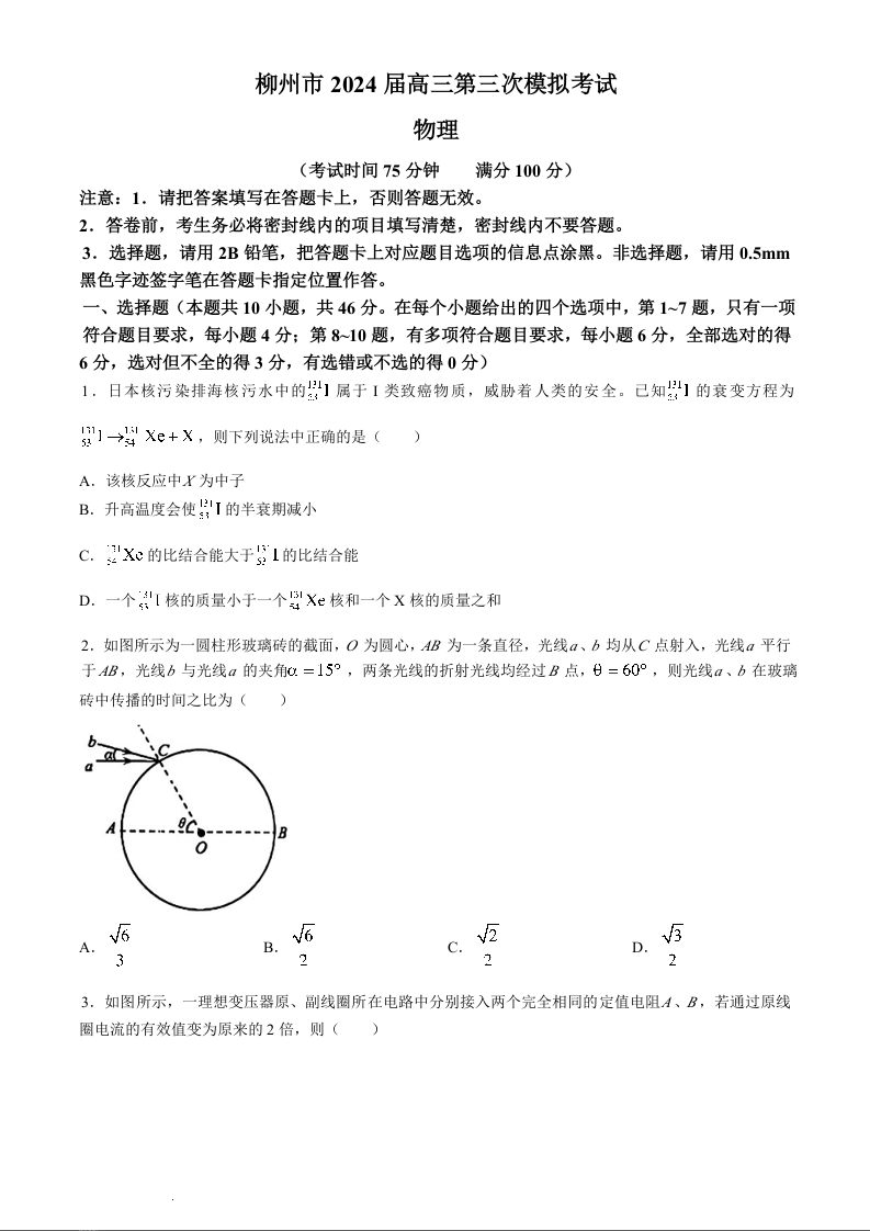 广西柳州市2024届高三下学期第三次模拟考试(柳州三模)物理