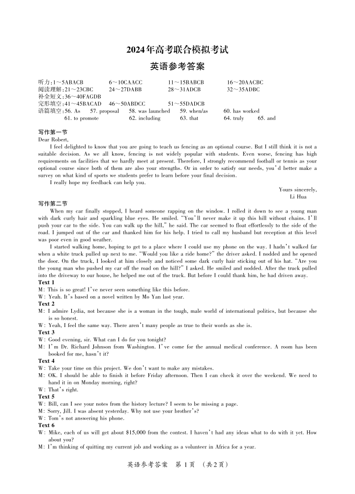 广西壮族自治区2024届高三3月联合模拟考试英语答案