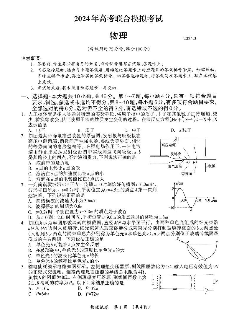 广西壮族自治区2024届高三3月联合模拟考试物理
