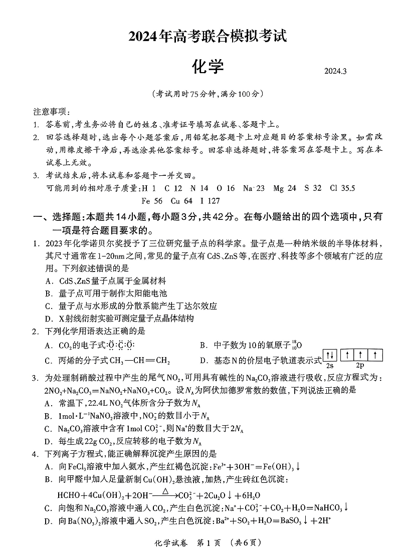广西壮族自治区2024届高三3月联合模拟考试化学