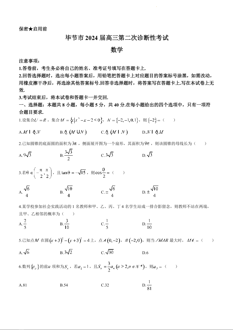 贵州省毕节市2024届高三下学期二模考试(毕节二模)数学+答案