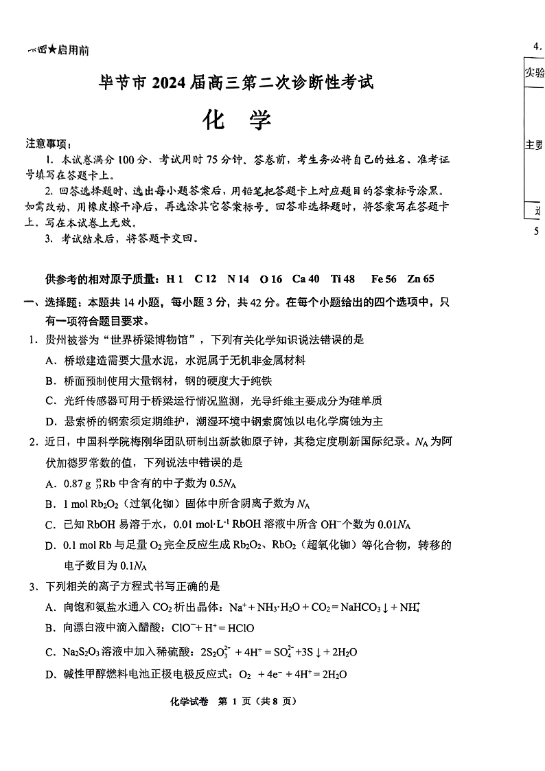 贵州省毕节市2024届高三下学期二模考试(毕节二模)化学+答案