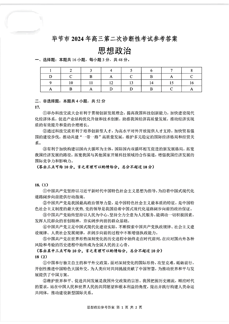 贵州省毕节市2024届高三下学期二模考试(毕节二模)政治答案
