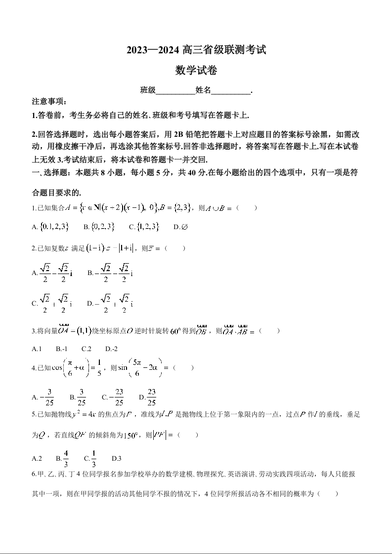 河北省2024届高三下学期省级联测考试(3月)数学+答案