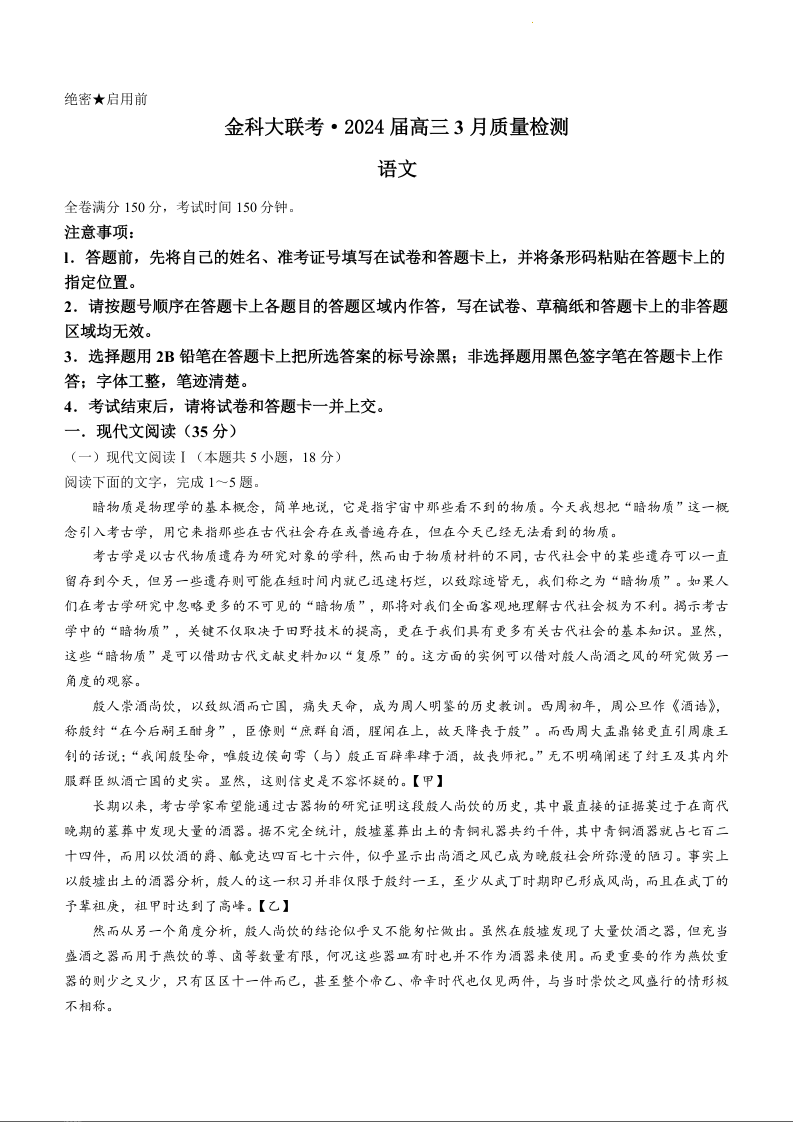 河北省金科大联考2024届高三下学期3月质量检测语文