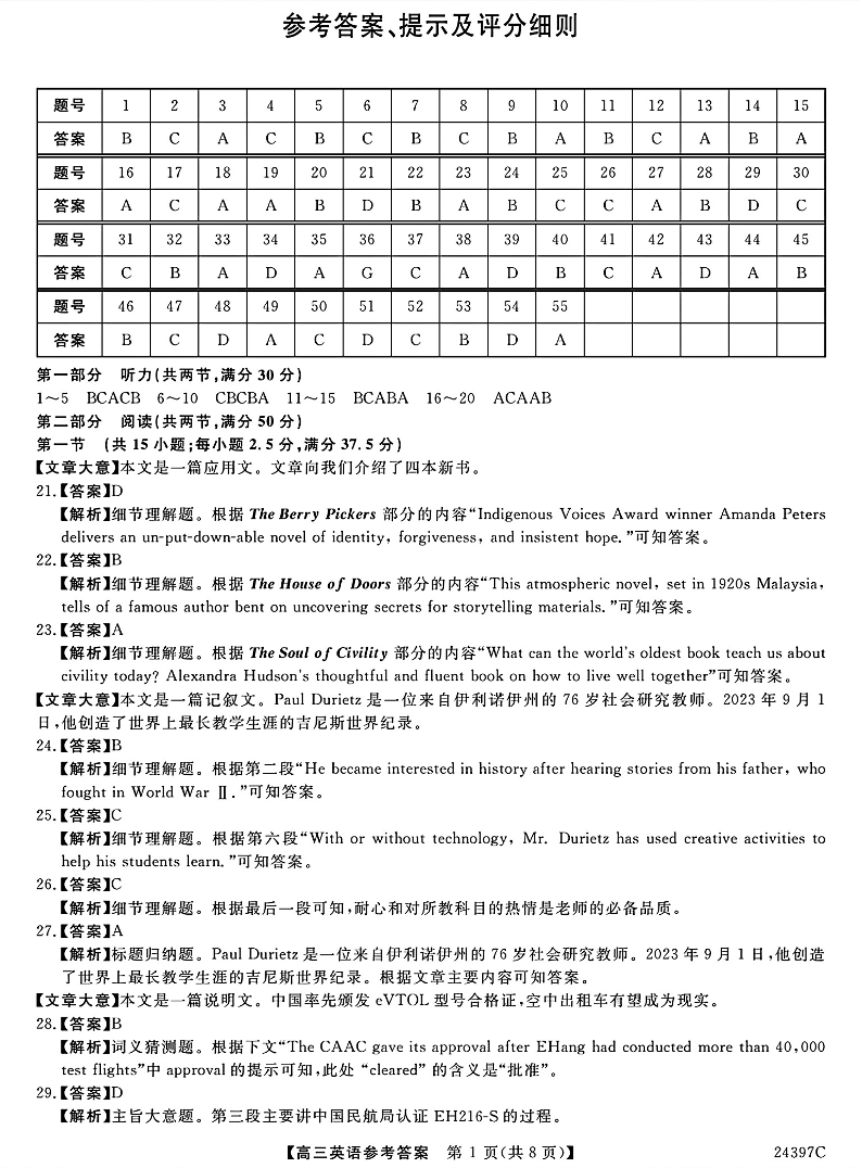 河北省金科大联考2024届高三下学期3月质量检测英语答案