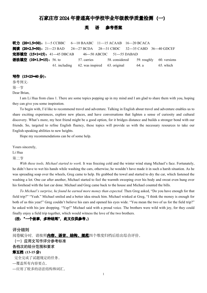 河北省石家庄市2024届普通高中学校毕业年级教学质量检测(一)英语答案