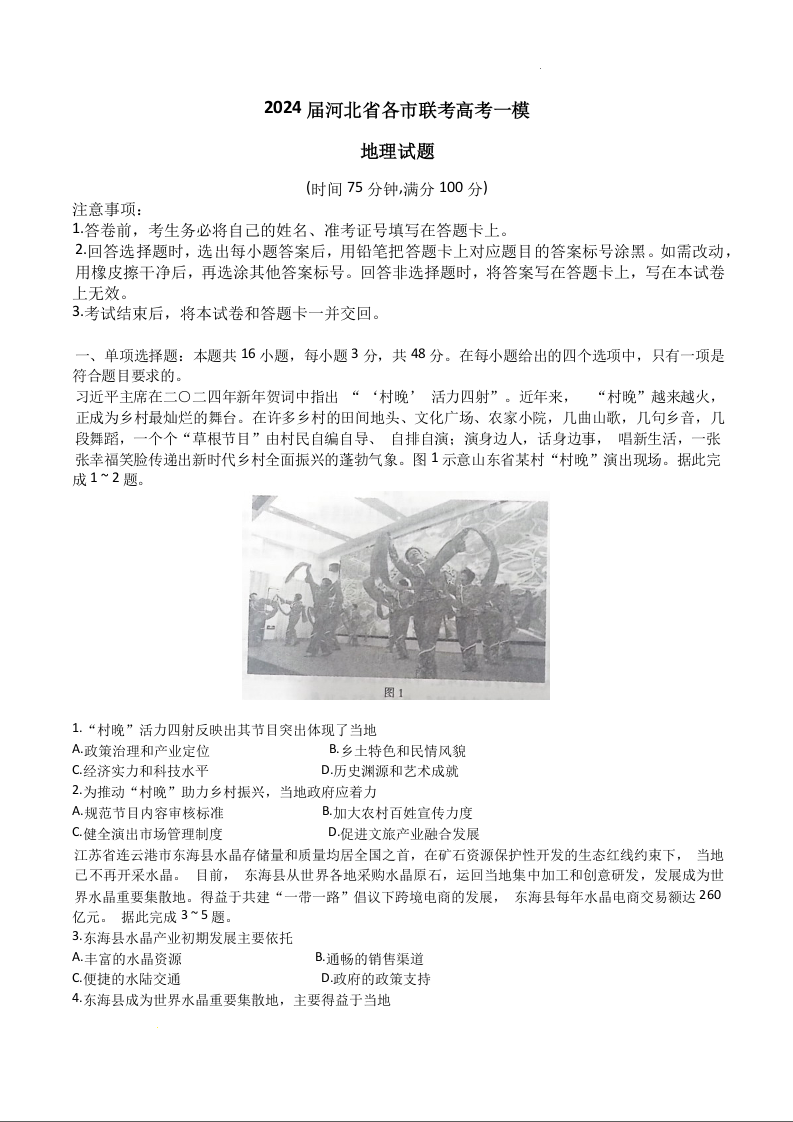 河北省石家庄市2024届普通高中学校毕业年级教学质量检测(一)地理